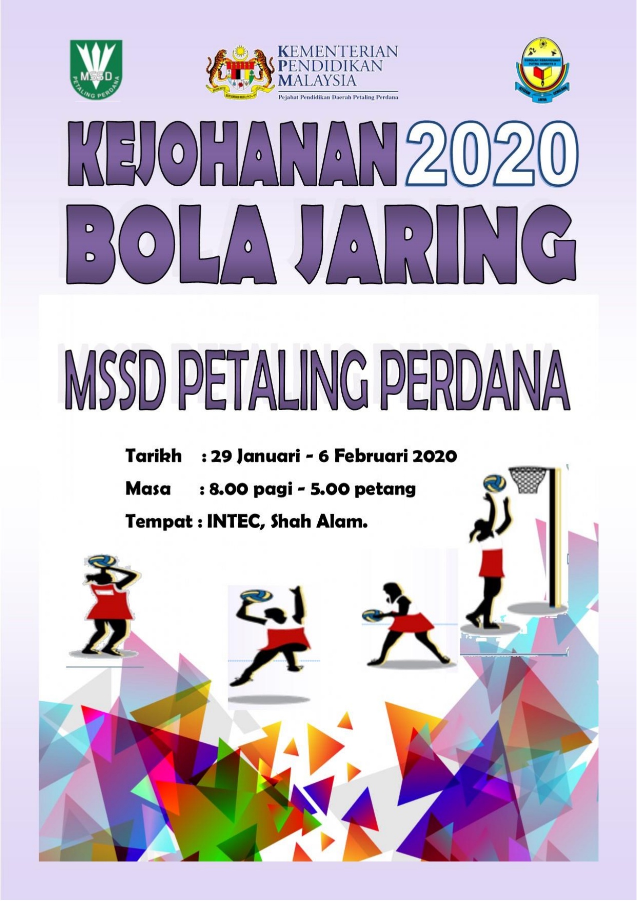 - Acara Murid Perempuan Tahun 56 - Bola Jaring ikut rumah sukan - Acara Murid Lelaki Tahun 34 - Pertunjukan Asas Sukan bolasepak - Acara Murid Perempuan Tahun 34 - Pertunjukan Asas Sukan bola jaring Tarikh. Dari 1970an hingga lewat 1980an bola jaring di bertaraf antarabangsa. Ucapan setinggi penghargaan kepada Jabatan Pendidikan Wilayah Persekutuan Kuala Lumpur khususnya Unit Sukan selaku Pengelola Kejohanan Ahli-ahli Jawatankuasa Pengelola PTPS MSSM dan MSSN Pengadil Kejohanan Pegawai Kejohanan Rakan Penaja Bola Jaring MSSM iaitu Milo dan Molten Pegawai Kontinjen Negeri Jurulatih Atlet Ibu Bapa dan.